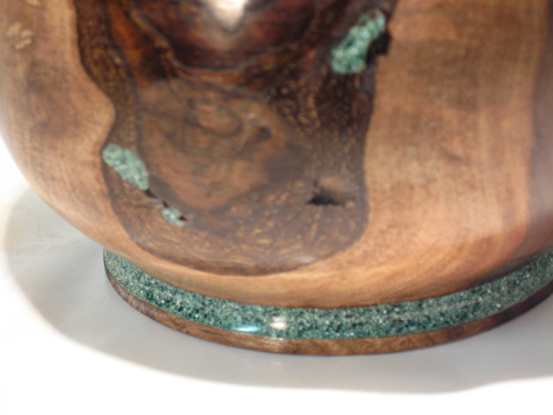 This walnut piece has several noteworthy accents. There is bark that runs from the top all the way down the side. It also has contrasting inlay around the bottom.